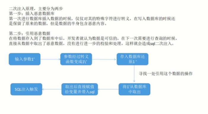 get_magic_quotes_gpc 对其中的特殊字符进行了转义,但是 addslashes 有一个特点就是虽然参数在过滤 后会添加 “\” 进行转义,但是 “\” 并不会插入到数据库中,在写入数据库的时候还是保留了原来的数 据。 在将数据存入到了数据库中之后,开发者就认为数据是可信的。在下一次进行需要进行查询的时候,直接 从数据库中取出了脏数据,没有进行下一步的检验和处理,这样就会造成 SQL 的二次注入。比如在第一次 插入数据的时候,数据中带有单引号,直接插入到了数据库中;然后在下一次使用中在拼凑的过程中,就 形成了二次注入.