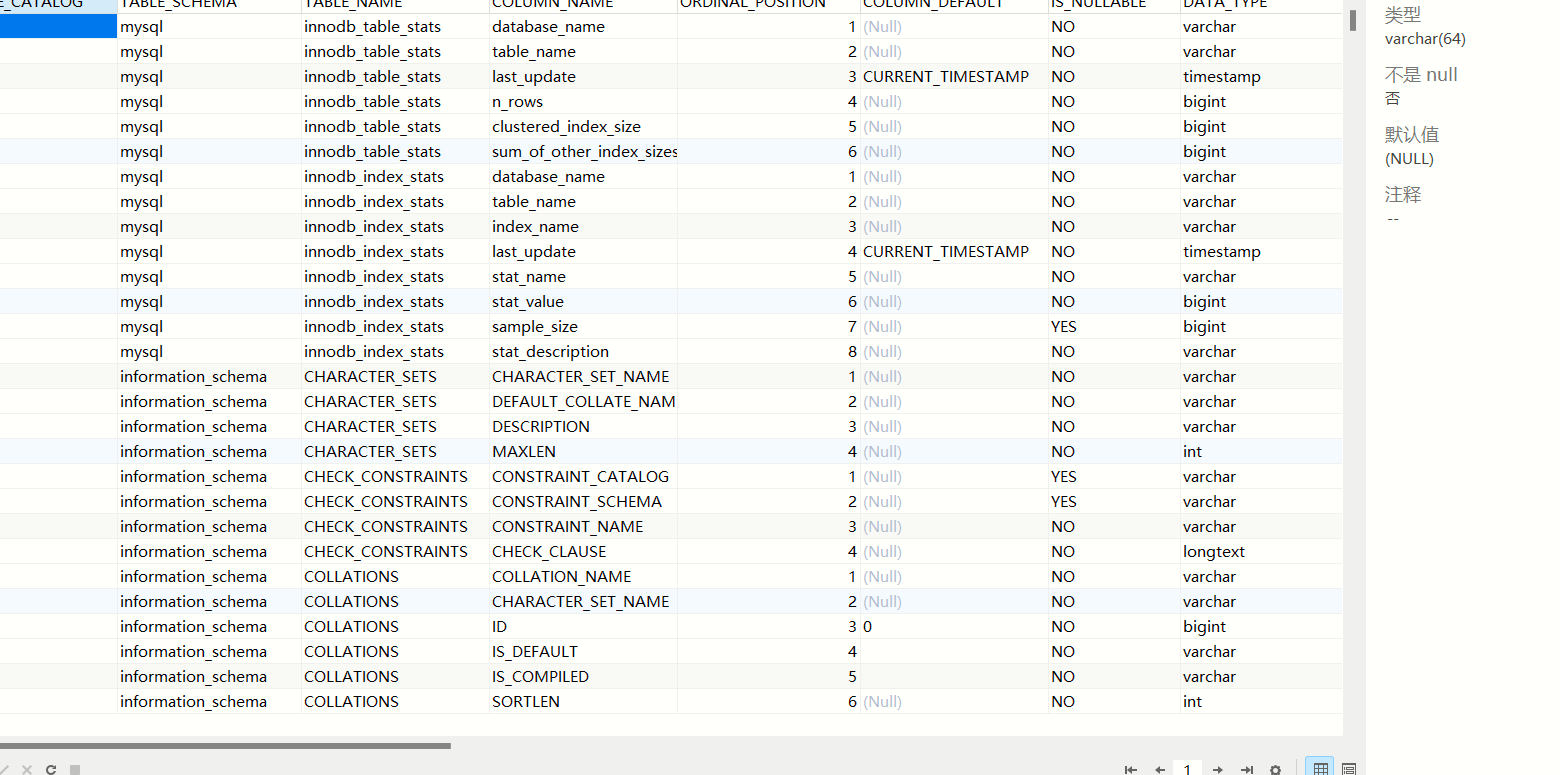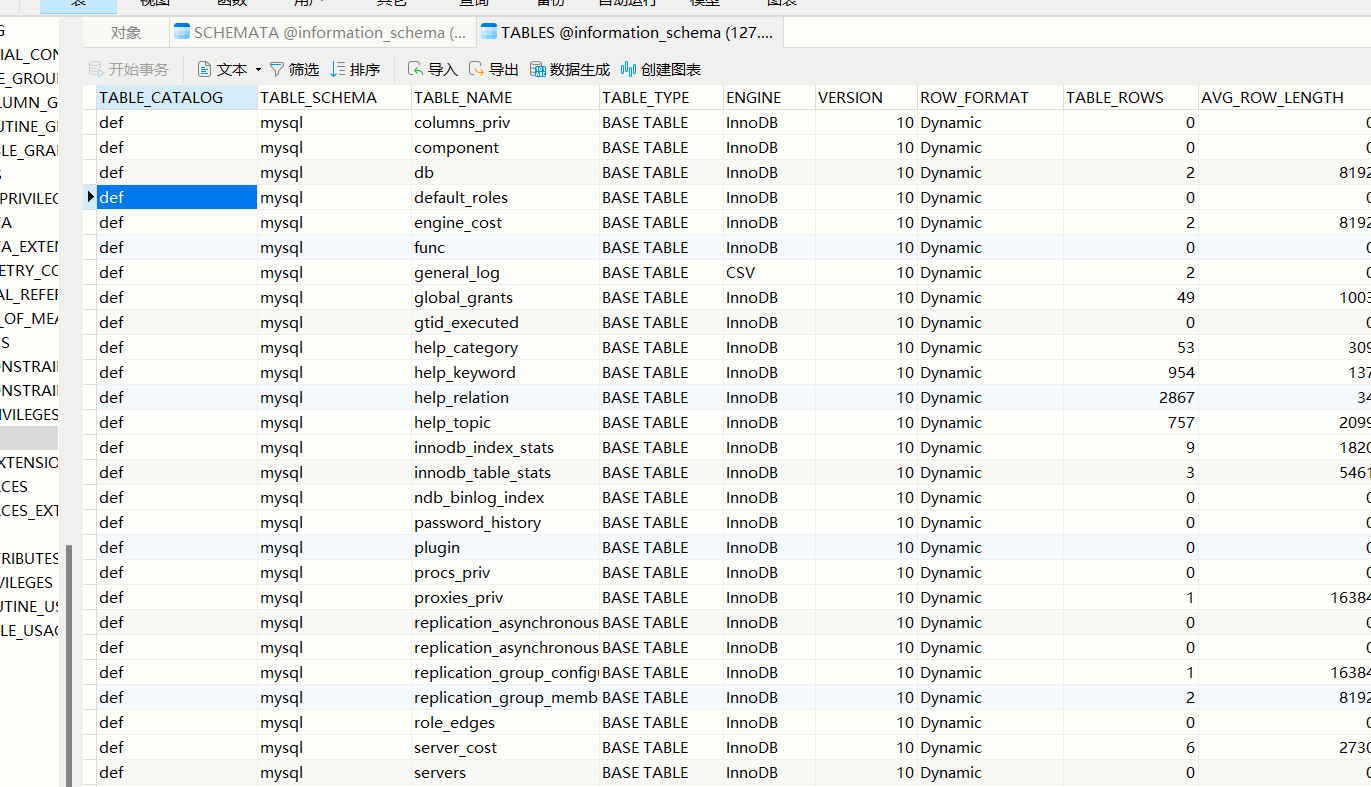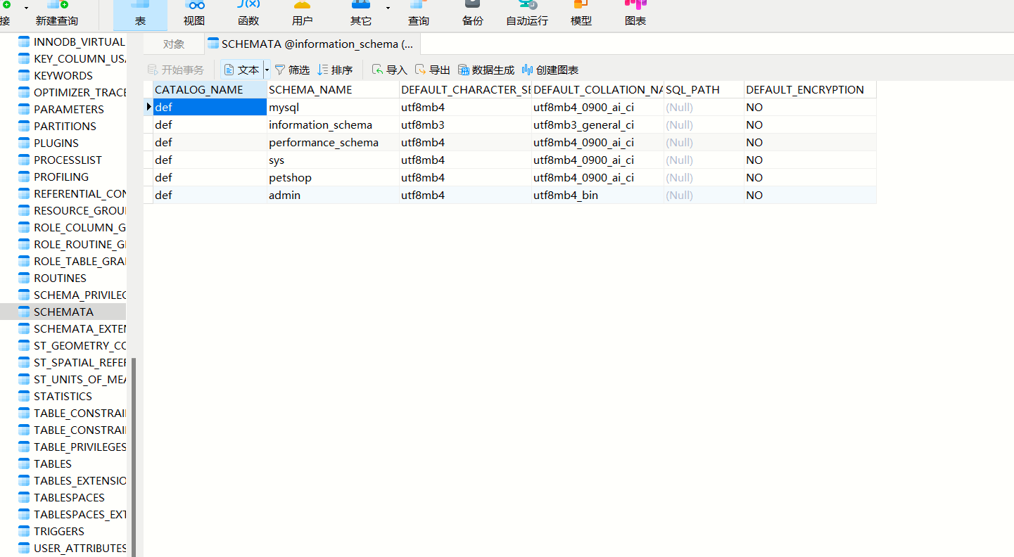 mysql15 以后默认存放一个 infomation_schema 里面 这个库里面有很多表 重点是这三个表 columns 、tables、schemata 表字段 CHEMA_NAME 记录着库的信息